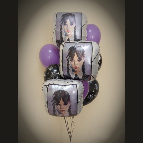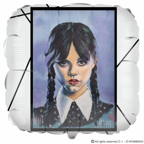 Ballons en aluminium de 17 pouces avec un portrait “Mercredi” imprimé sur toute la surface du produit.